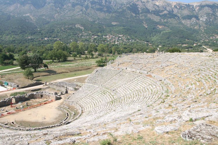 Il teatro, attualmente in corso di restauro (2008), è uno dei più grande di Grecia con suoi 130 m di diametro. Risale al IIIe secolo aC.